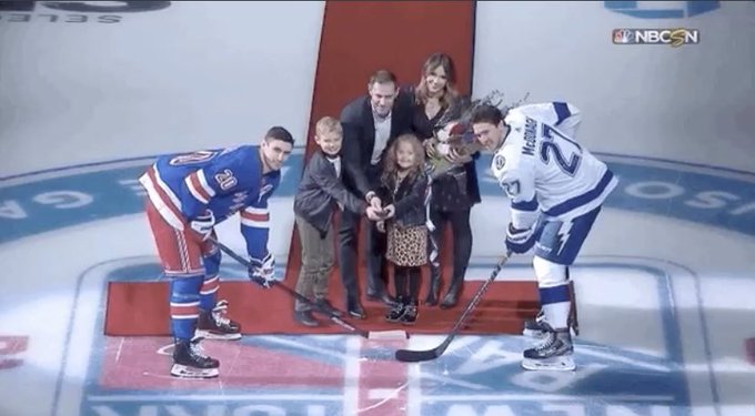 If it was me running this thing, I would’ve dedicated at least 20 minutes to this. The Rangers were playing the Lightning, which means you had all of Girardi’s recent teammates there, plus a few holdovers from Girardi’s time with the Rangers.