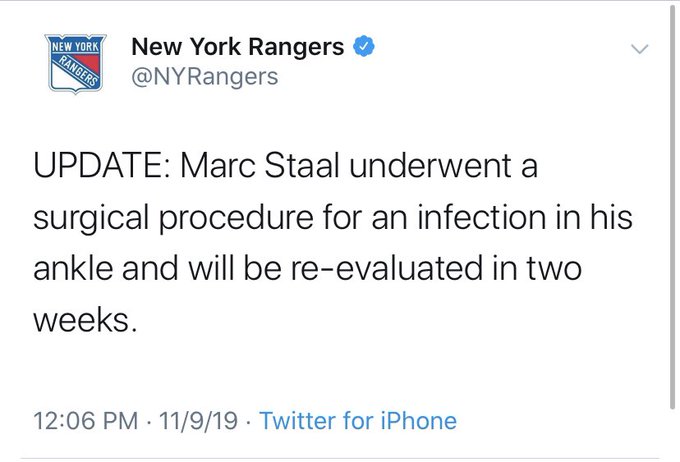 The biggest news was that Marc Staal will now be out for at least two weeks, as he had to get surgery after receiving an infection on his ankle. I guess this was one of the injuries that Quinn was referring to in his media talk, prior to the game with Carolina on Thursday.