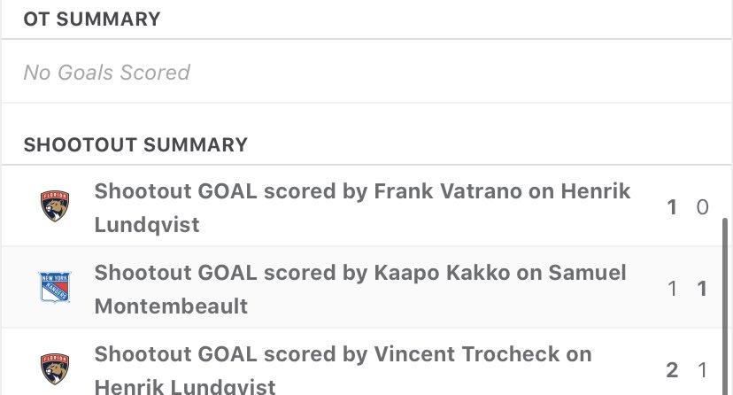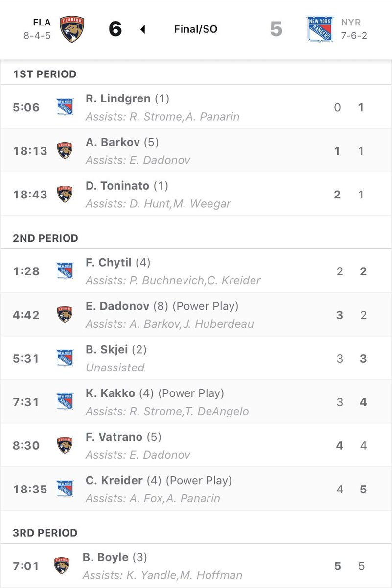 In the shoot-out, the FULL MONTY stopped Panarin and DeAngelo. Panarin probably should’ve scored here, but didn’t lift the puck enough. With Vatrano scoring, and the Panthers up 1-0, on the third Rangers attempt, an attempt the Rangers needed to convert on to stay alive, Kakko, the 18 year old wonder kid, handled the pressure and scored. Immediately after, like how he did all game, Lundqvist choked and was beat easily by Trocheck. 6-5, BAD GUYS, your final from M$G.