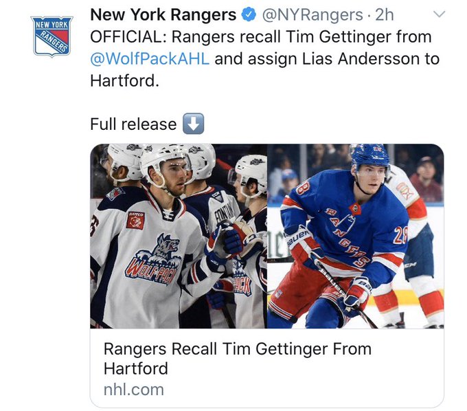The New York Rangers announced today that the team has recalled Tim Gettinger from the Hartford Wolf Pack of the American Hockey League (AHL). In addition, the Blueshirts have assigned Lias Andersson to Hartford.