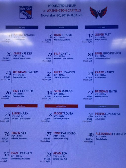I should also mention this. Whenever you think the Rangers have been kicked in the dick so hard, that they just look out of it, they always step up. It seems like after every bad loss, the Rangers are beating one of the best teams in the league, whether it’s Tampa, Buffalo and now Washington. Now, here on 11/20/19, David Quinn has to string some wins together and keep this team motivated for more than one game at a time.
