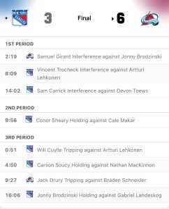 The Blueshirts were also a man-down on SIX, count ’em, six, separate instances – and where they killed off five of these Avalanche power-play tries.