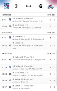 Following another failed Rangers’ odd-man rush in the Colorado end – and boom – who else, but former league MVP, Mr. MacKinnon, to bang home a puck that Makar just smashed the post on.