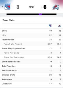 — The Blueshirts, and for the third consecutive game, finished with only nineteen shots on goal. To compare, and the Avalanche finished with thirty-five shots on goal – and that figure doesn’t include the two rings of “Igor’s Iron” (both by Cale Makar) either.