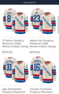 You gotta be outta your mind to pay $300+ (with shipping and tax) for a one-time Rangers’ 2026 Winter Classic jersey. Furthermore? Then their 2012 rendition, which also features this cream away color, is far superior when compared to this desperate cash grab. Another thought? How many effing jerseys do the Blueshirts need this season? Heck, it feels like they have more jerseys than wins during this centennial campaign! Photo Credit: NYR
