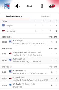 After all, then going into Wednesday night in Raleigh – and there was no doubt in my mind that the first-place Hurricanes would handle the Rangers with ease – and just as they did several weeks ago on M$G ice by a 3-0 final.