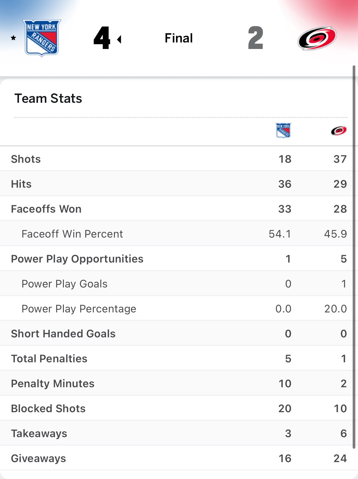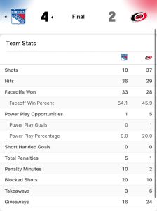 The Blueshirts were massively out-shot and at one point, the first period SOG totals read as Carolina 11, New York 1.