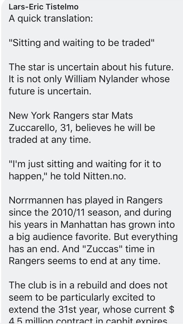 For those who don’t have the time to Google translate the entire interview, here is what Zuccarello said, courtesy of Rangers fan, Lars-Eric Tistelmo: