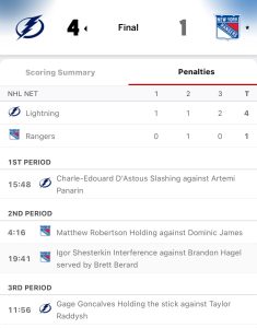 Tampa came out like gangbusters – and where it was a complete shock that they didn’t have a field goal lead by the time that they scored their first goal – and as new Ranger Killer, Brandon Hagel, scored at the 10:53 mark of the first period.