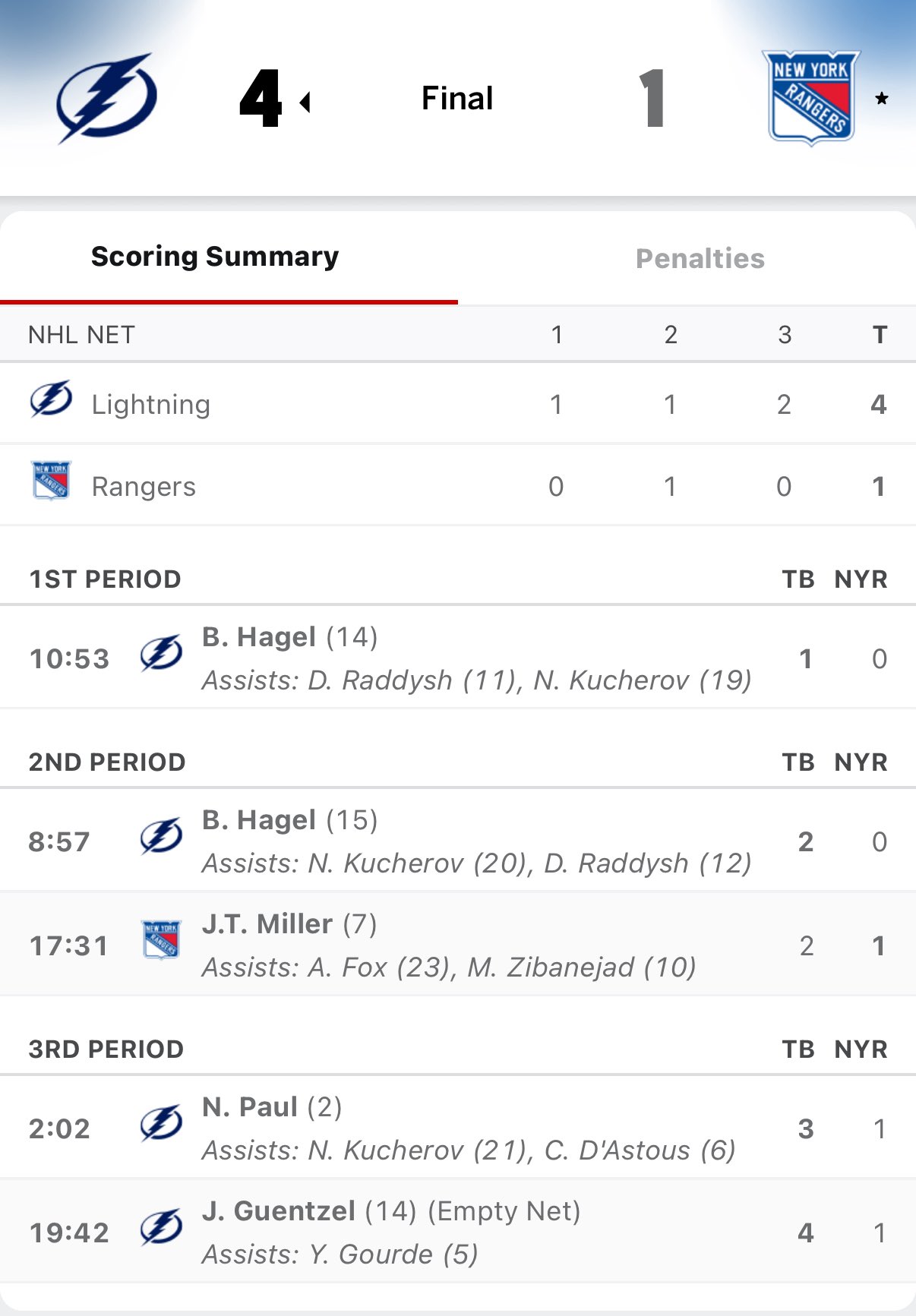 2-0 Bolts – and two goals for Hagel – and two assists a piece for both Raddysh and Kucherov too.