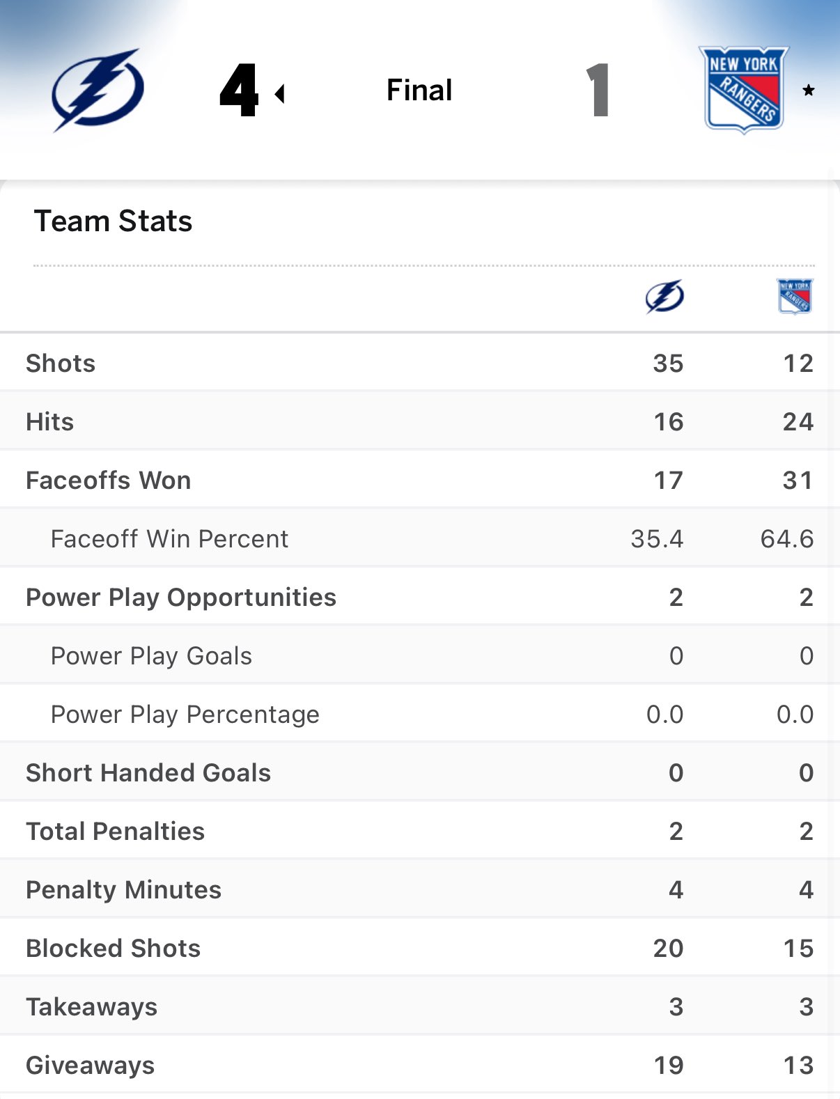 This goal, scored on Tampa’s tenth shot, also meant that the Bolts had as many goals as the Rangers had shots on goal.