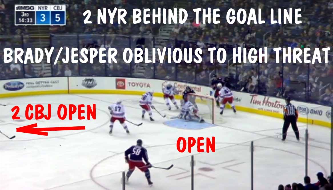 At 14:00, after losing another defensive zone faceoff, Cam Atkinson immediately scored while Brendan Smith enjoyed watching. 3-2 bad guys. At this period of time, CBJ were winning the faceoff battle at a score of 28-6.