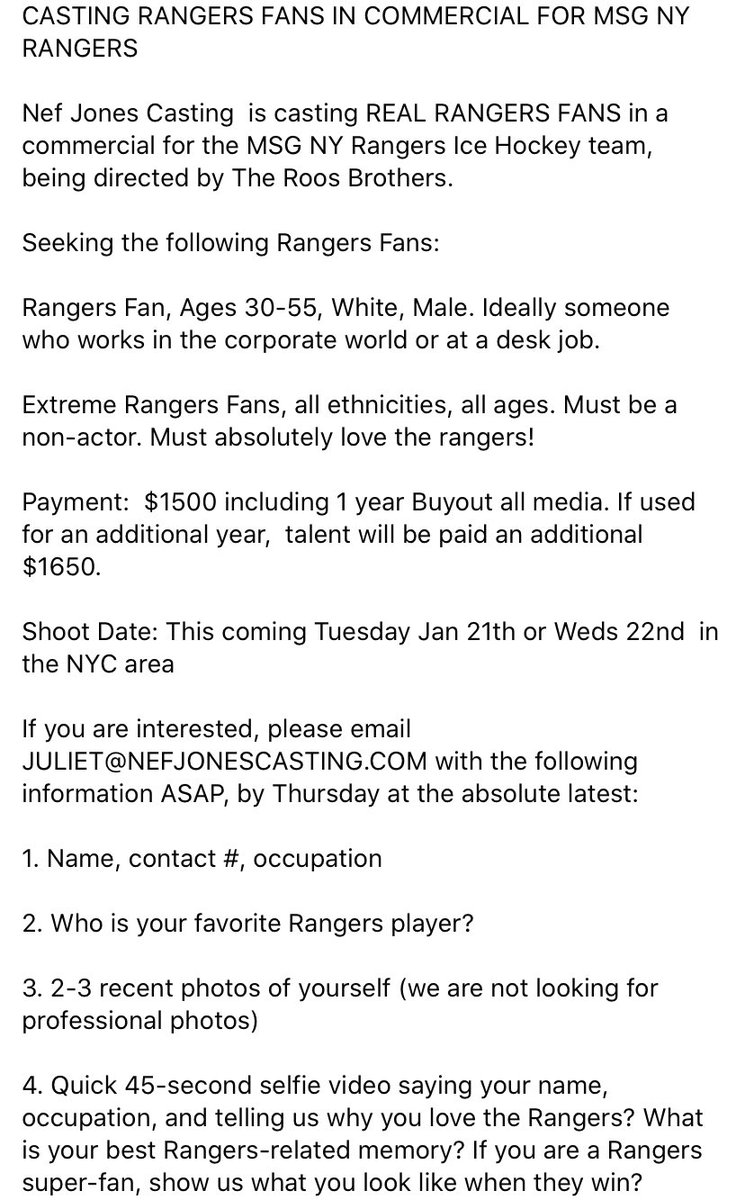 If you’re interested, the above press release that was sent to me, is your chance at appearing in one of those goofy commercials that air on the M$G Networks. Please, if you married a Devils fan, please don’t apply. I can’t stand that commercial!