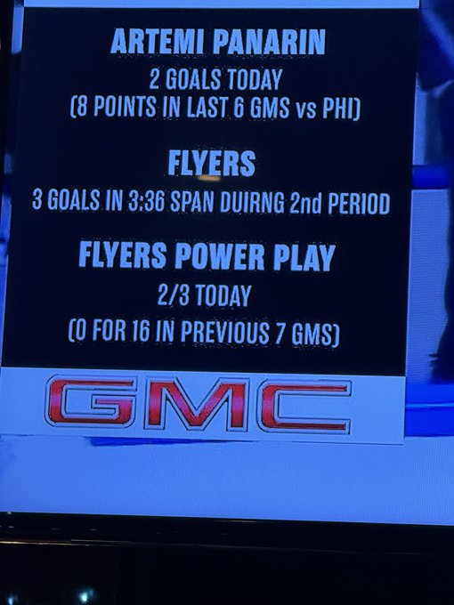 — Another Flyers’ power-play, earned at the 10:15 mark after Panarin had slashed Denver “I’m Wayne Gretzky Tonight” Barkey, led to a Trevor Zegras 3-1 power-play goal – and just three-seconds into the man-up time.