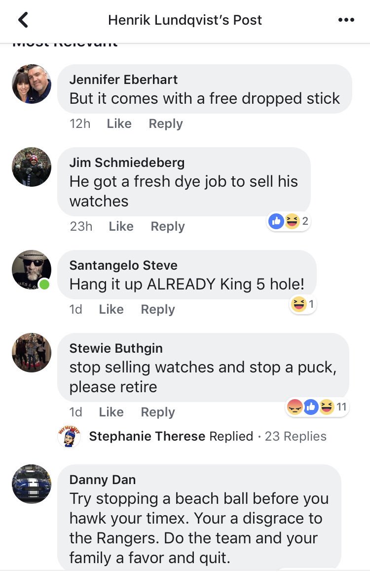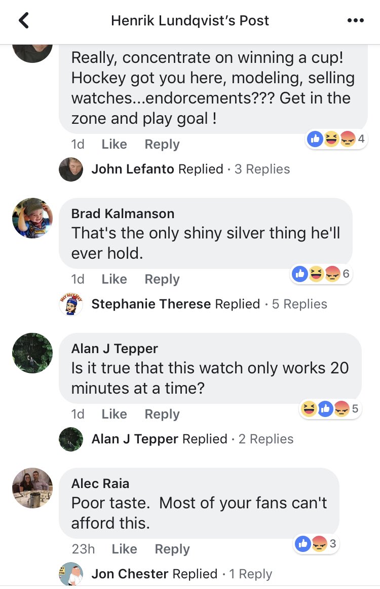 I noticed I wasn’t the only one who was laughing at Lundqvist and his watch. Here are some comments from Lundqvist’s own facebook page: