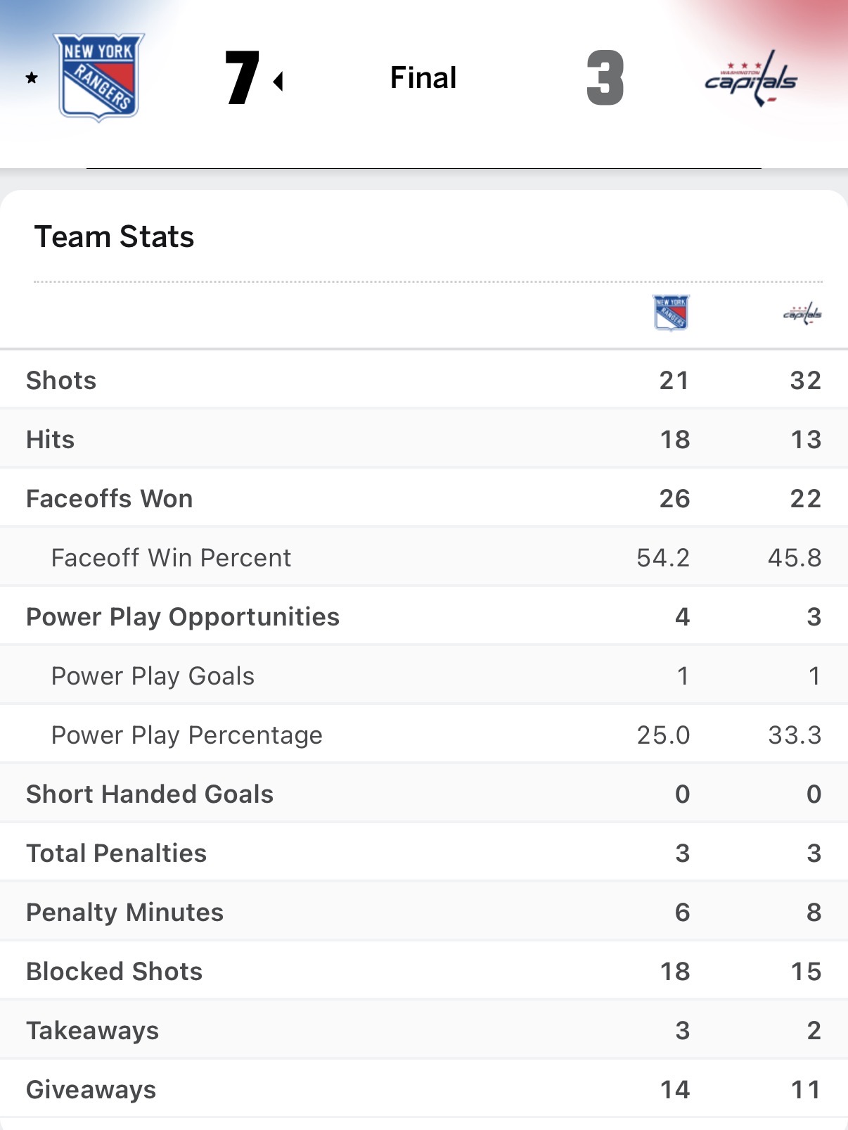 The Rangers scored seven goals tonight, their competition three.