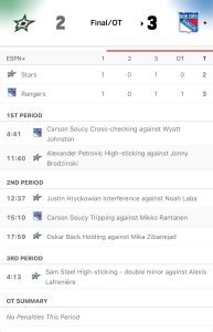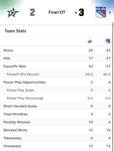 The Stars, and long prior to the Rangers’ multiple elongated attacks, once had a 6-1 SOG advantage, the combination of many Ranger turnovers and strong puck possession.