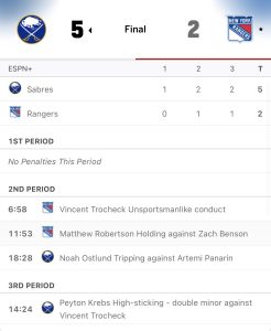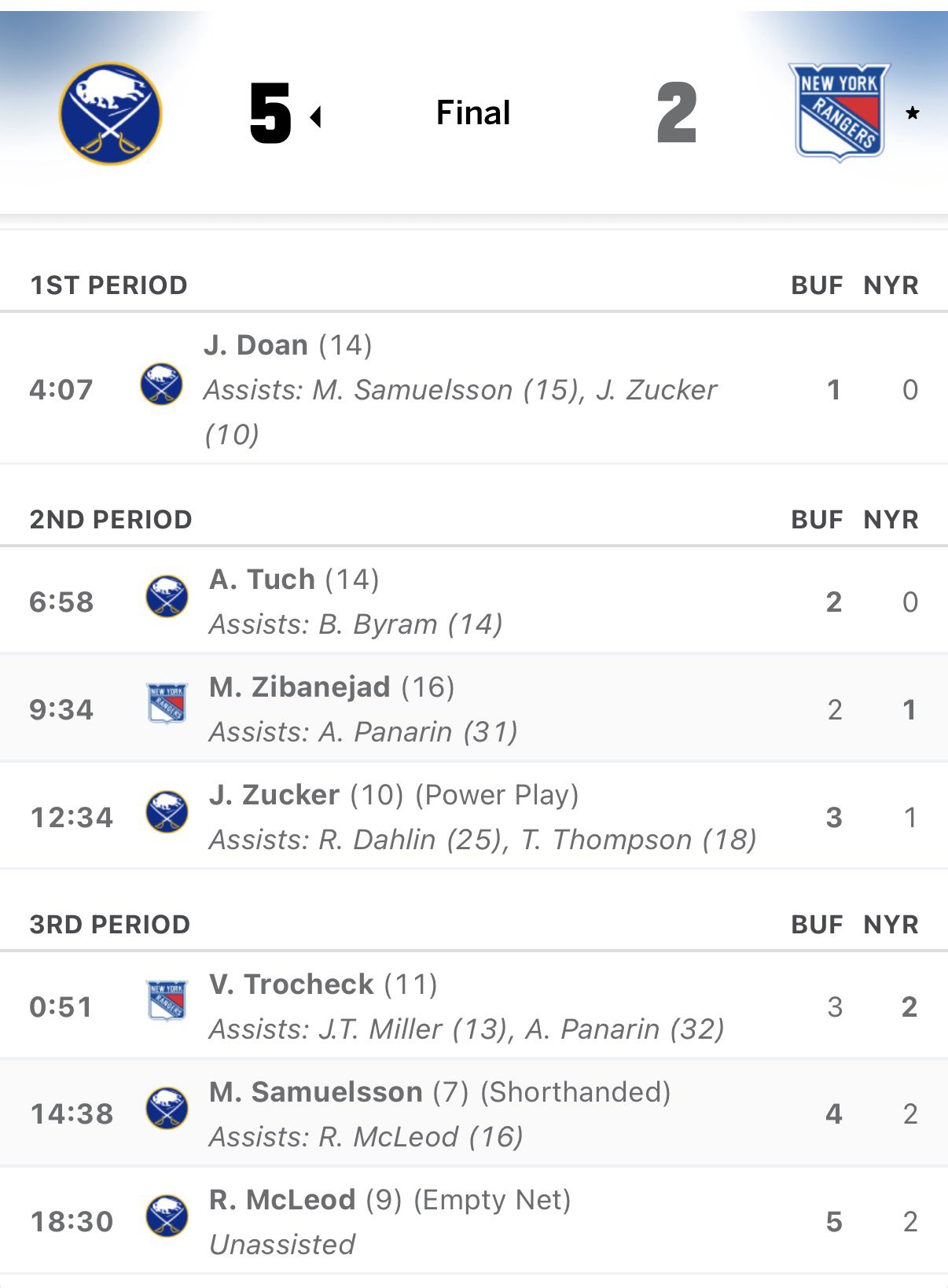 The Sabres, now on their second power-play, increased their lead by two, as a Dahlin shot hit Quick, the puck then hit Zucker’s butt and then went into the Rangers’ net – and as it did with 7:26 remaining:
