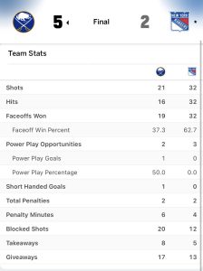 Some twenty-minutes in game-time later, then the Sabres turned the tables a bit, as not only did they out-shoot the Blueshirts 14-11 – but they also won where it mattered too – on the scoreboard – and as they did, 2-1 – and for a cumulative score of 3-1.