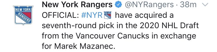 On Tuesday afternoon, the Rangers announced the trade mentioned above. As a result of this trade and the trade of McLeod to Nashville, the Rangers now have three different seventh round picks in the 2020 NHL draft. Whether the Rangers hold on to all three picks or trade some of them down the line in potential future trades; well that remains to be seen.