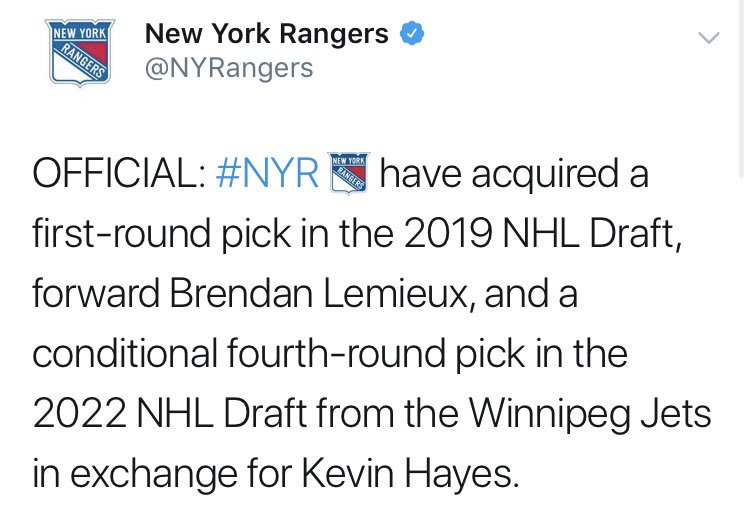 — The Rangers acquire Brendan Lemieux and Winnipeg’s first round draft pick of the 2019 NHL Draft. The Rangers also acquire Winnipeg’s fourth round pick of the 2022 NHL Draft, providing the Jets win the Stanley Cup this season.