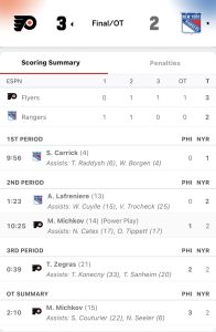The Flyers cleared the rubber, Michkov, now out of the box, got the puck – and then blew past J.T. Miller – a defeated captain as he just stopped skating (he’s done this before – so save me the “he was tired” excuse) – for the 3-2, Rangers suck, goal.