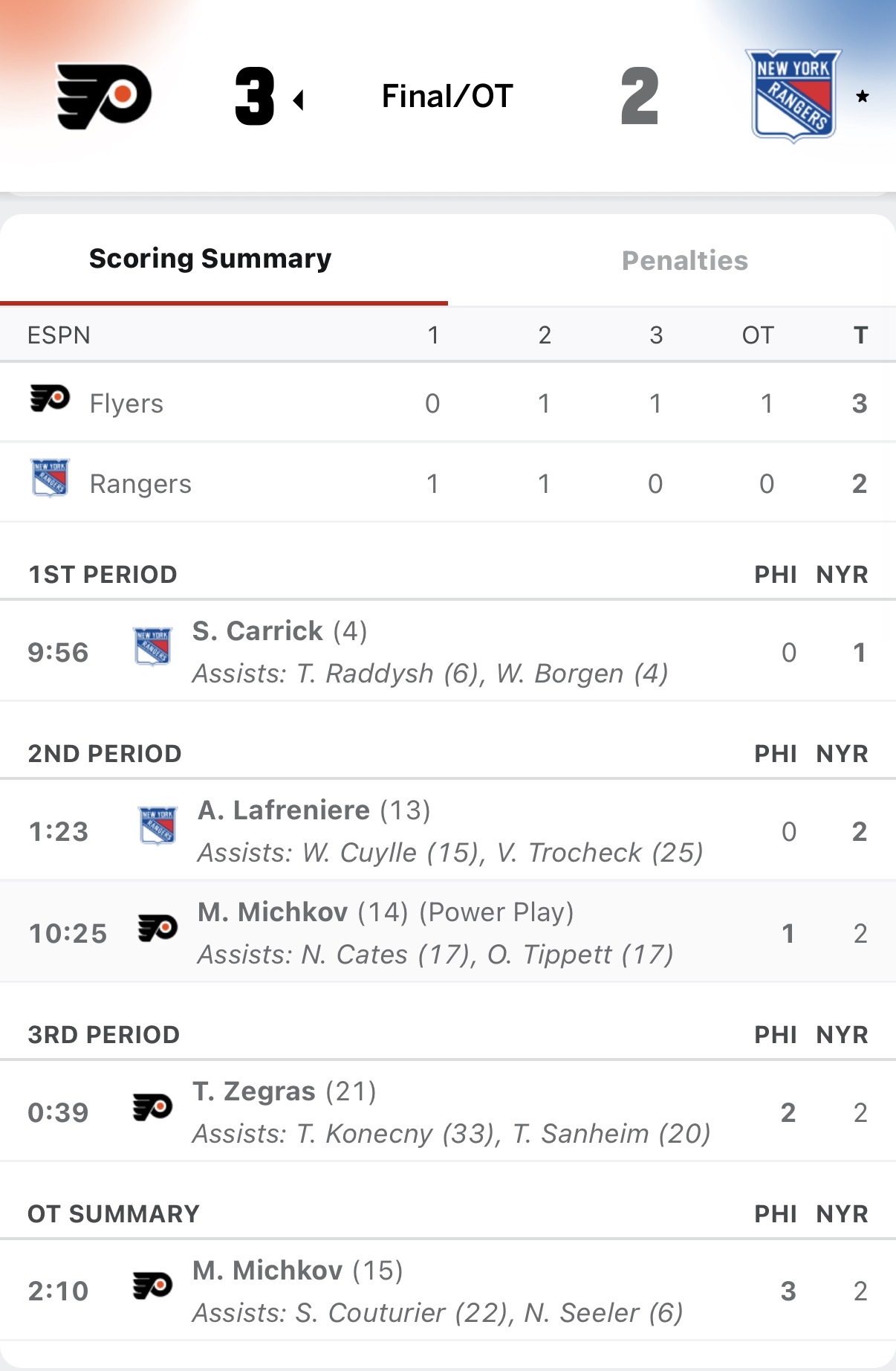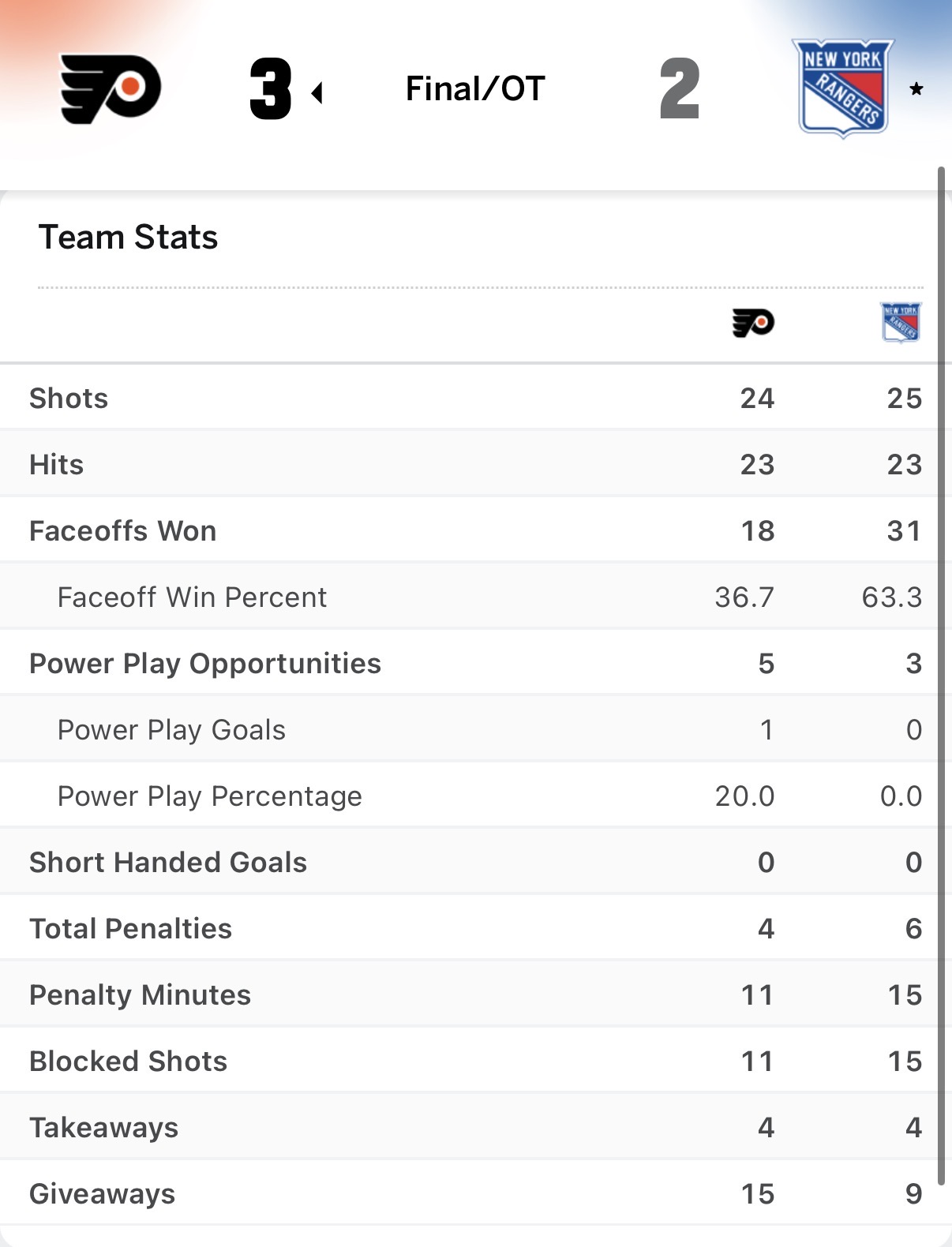 Philadelphia went only 1-5 on the power-play, while New York went 0-3 – including the aforementioned 4 x 3 man-up to start the overtime period.