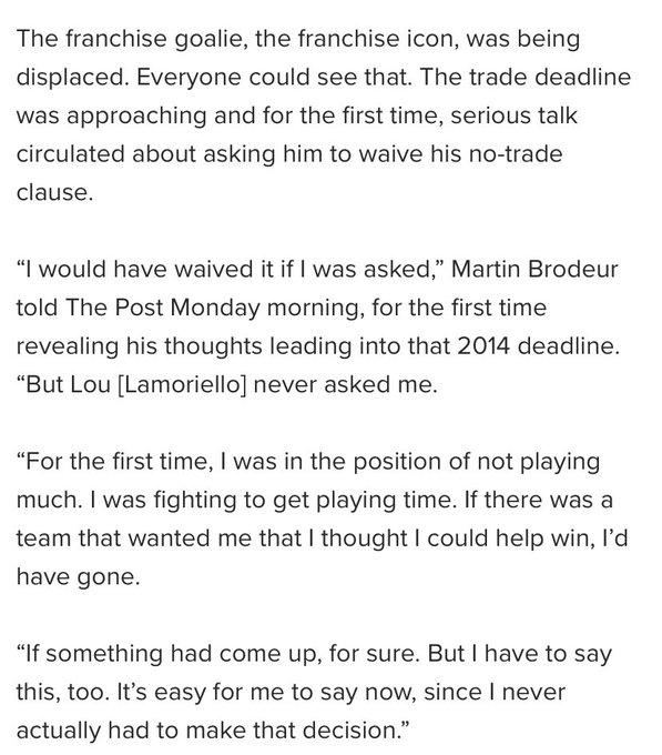 When Marty aged out and the Devils were moving on, Marty was already one of the greatest goalies of all time and had won three Stanley Cups. However, he still wanted to win and would’ve waived his NMC to chase a Cup somewhere.
