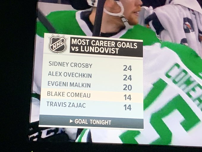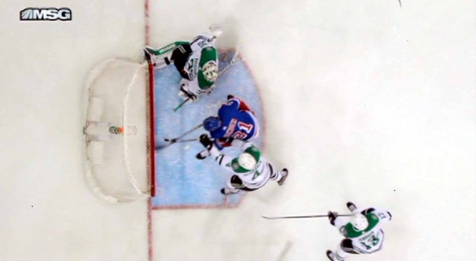 After winning the draw in the Rangers defensive zone, Dallas hit the cross-bar. The puck flew up right to the glass and about an inch away from the netting. Right after this shot, Joe Pavelski tipped in a puck through the five-hole of Lundswiss: