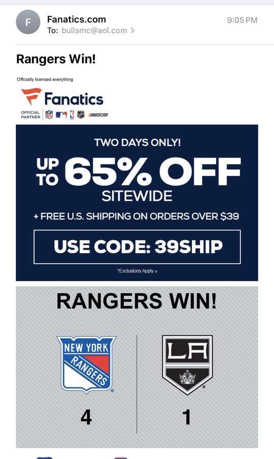 P.S. While I think Fanatics.com does a great job with getting orders out (they made my CZAR IGOR jersey), I can do without the 786786768967896 emails a day. The new thing from Fanatics? Emailing you right after your team wins a regular season game: