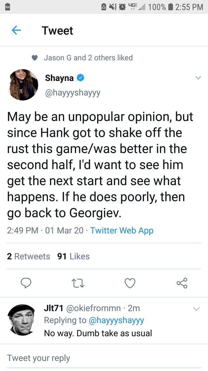 I probably would have went with Hank because face it he will have to play some games but I would have pulled him between the first and second periods and put Georgy in just to try and change the momentum.