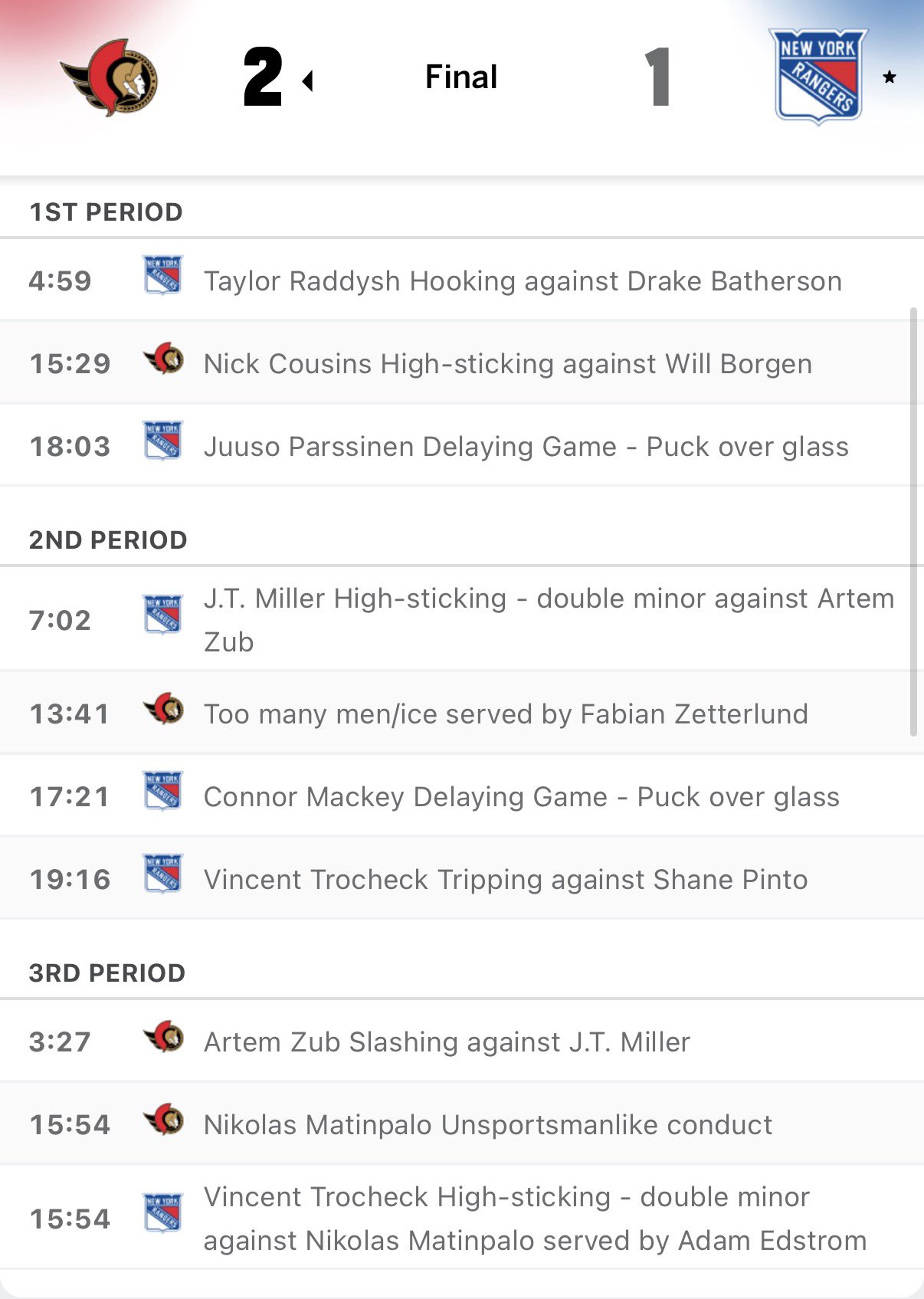 Come the horn and the Rangers’ PK was now 4/5 and where the Sens would also open the third period with a 1:16 power-play.