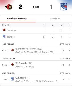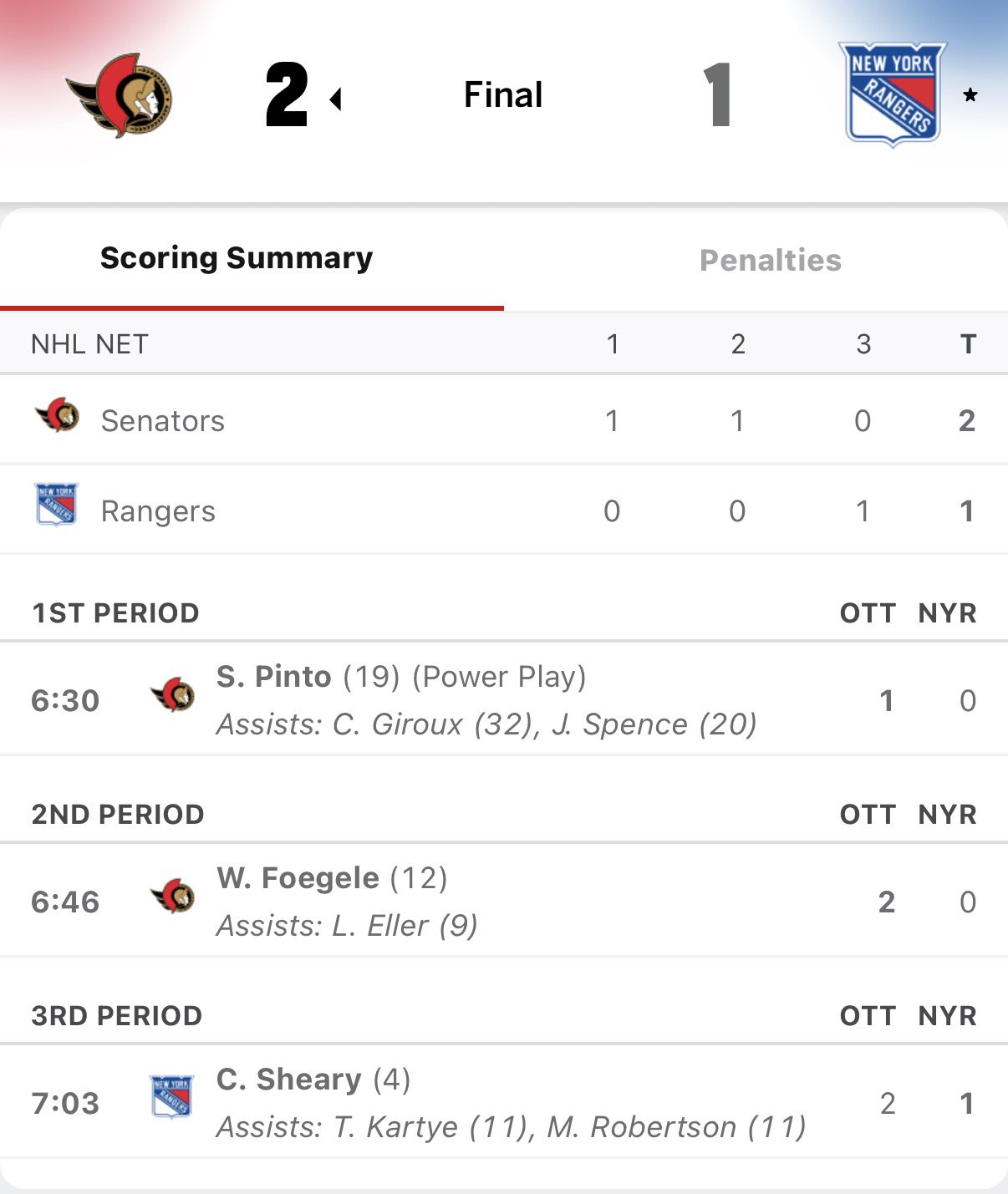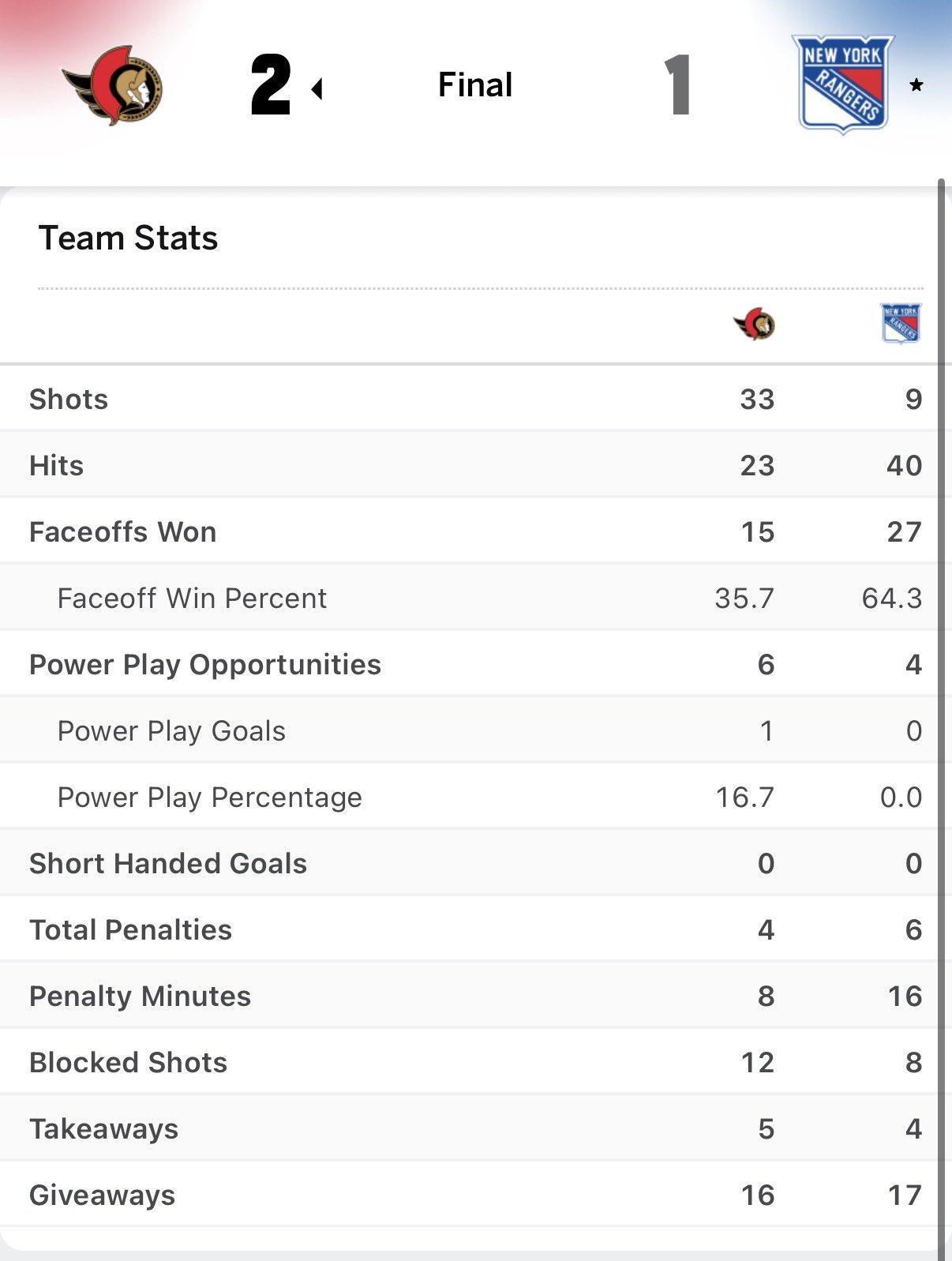 2-1, Sens, in a nine shot on goal loss for the Rangers.