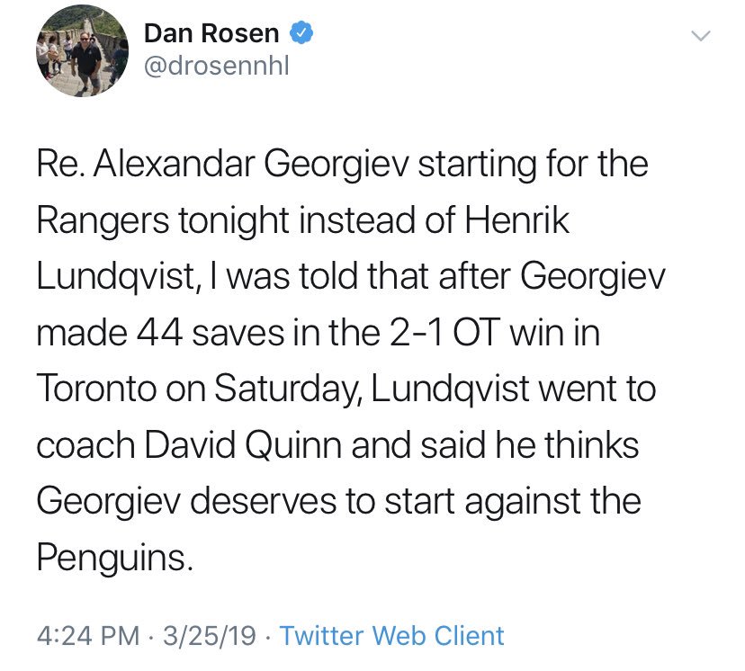 You know the deal – if Georgiev starts, bet the under. If Lundswiss starts watch the line jump to -6.5. Even if the line jumps, bet the over if Hank starts. Hank is the personal property of the Penguins. #nyr pic.twitter.com/RxqTYeGNyY