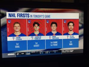 Bada-bing-bada-boom – the SPOTLIGHT PLAYER lit up the room – and as Lafreniere did after deflecting an Adam Fox (I haven’t mentioned his name that much – does that tell you something?) point shot for the Blueshirts’ 5-1 goal: