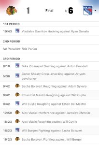 The Rangers got a power-play out of this (again, check the PENALTIES segment for all of it), but with a five-goal lead – and they were just interested in running the clock out – the right move – and why you shouldn’t put much into the overall 1/3 man-up showing either.