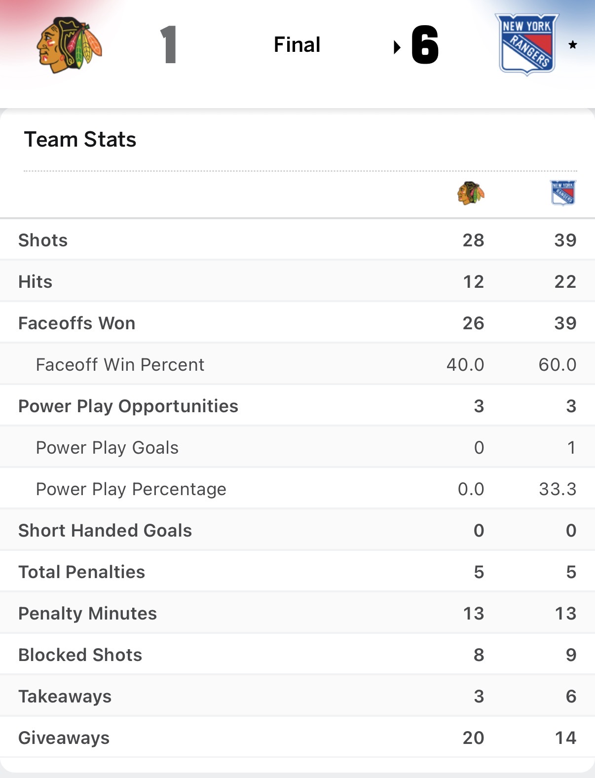 Only a third period, with the Rangers up big and playing conservatively, allowed Chicago to improve their totals, as the Hawks, long dead-and-buried, finished the third period with a 14-8 SOG edge.