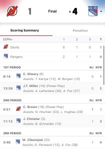 Then frequent “Ranger Killer,” Jack Hughes, who scored three-points a piece during the Devils’ previous back-to-back 6-3 victories against Blueshirts, went scoreless tonight.