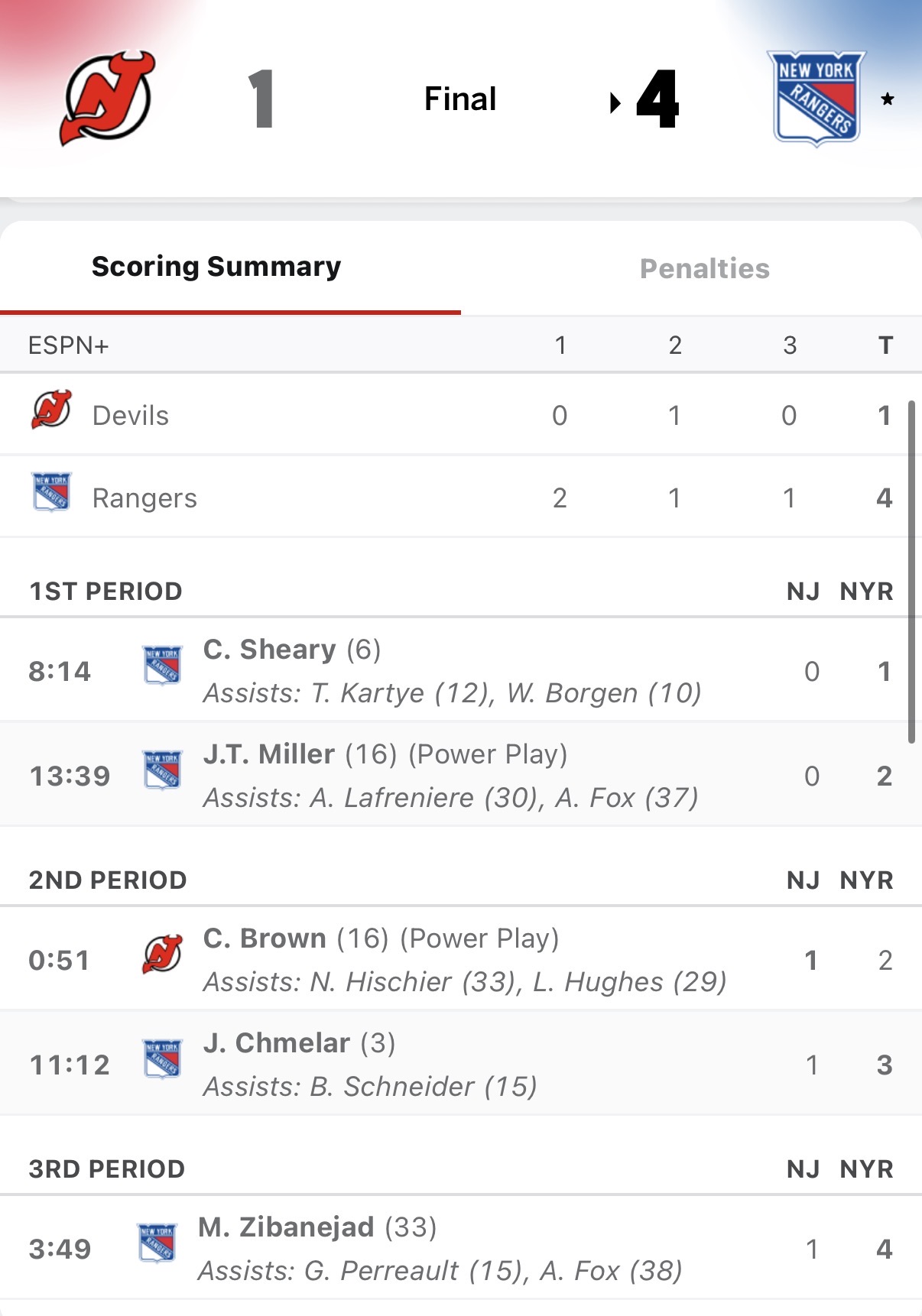 A perfectly executed play, Fox-to-Lafreniere-to-Miller, for the 2-0 power-play tap-in goal, was scored at the 13:39 mark.