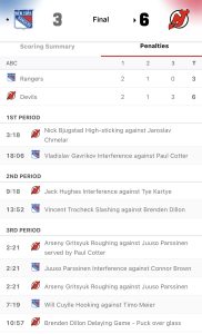 Mika turned over the puck, Devils killed 20-seconds in the Rangers’ zone, Mika breaks his stick on his no-timer, Devils kill more time and the Blueshirts, nary a SOG during all of this, were now a futile 0-7 on special teams.
