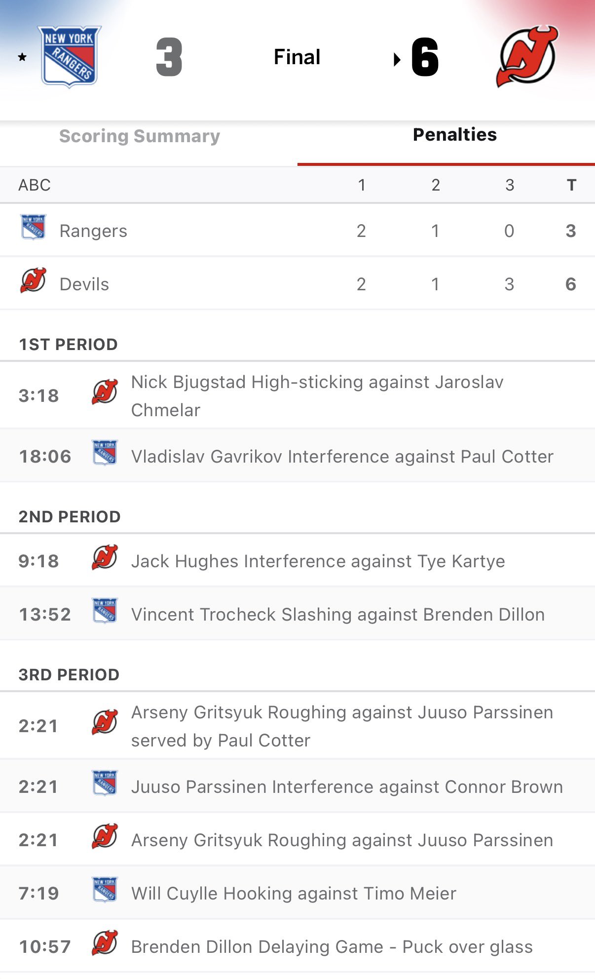 After the Rangers failed on the power-play again, the Devils then drew one themselves, and as they did at the 13:52 mark of the frame, following a Trocheck slash on Brenden Dillon.