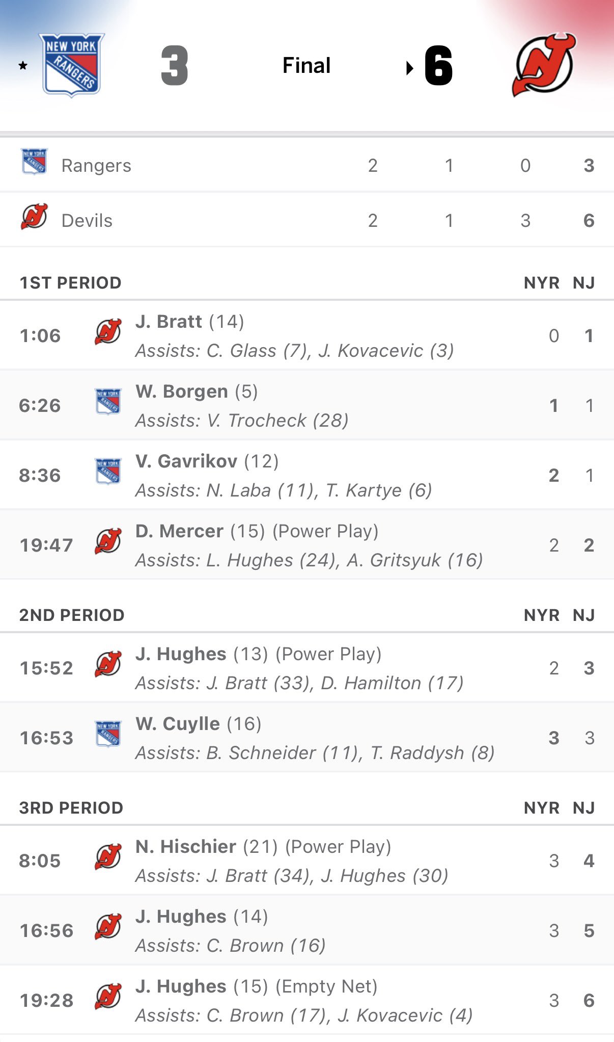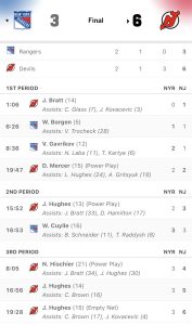 In front of a red-hot crowd (again – kudos to Devil fans – as I actually forgot what crowd noise was after watching the Rangers at M$G this season), and it only took 66.6 seconds – fitting for Satan’s favorite hockey team – for Jesper Bratt to open the scoring – the end result of another early odd-man rush goal as afforded by the brutally bad Blueshirts.