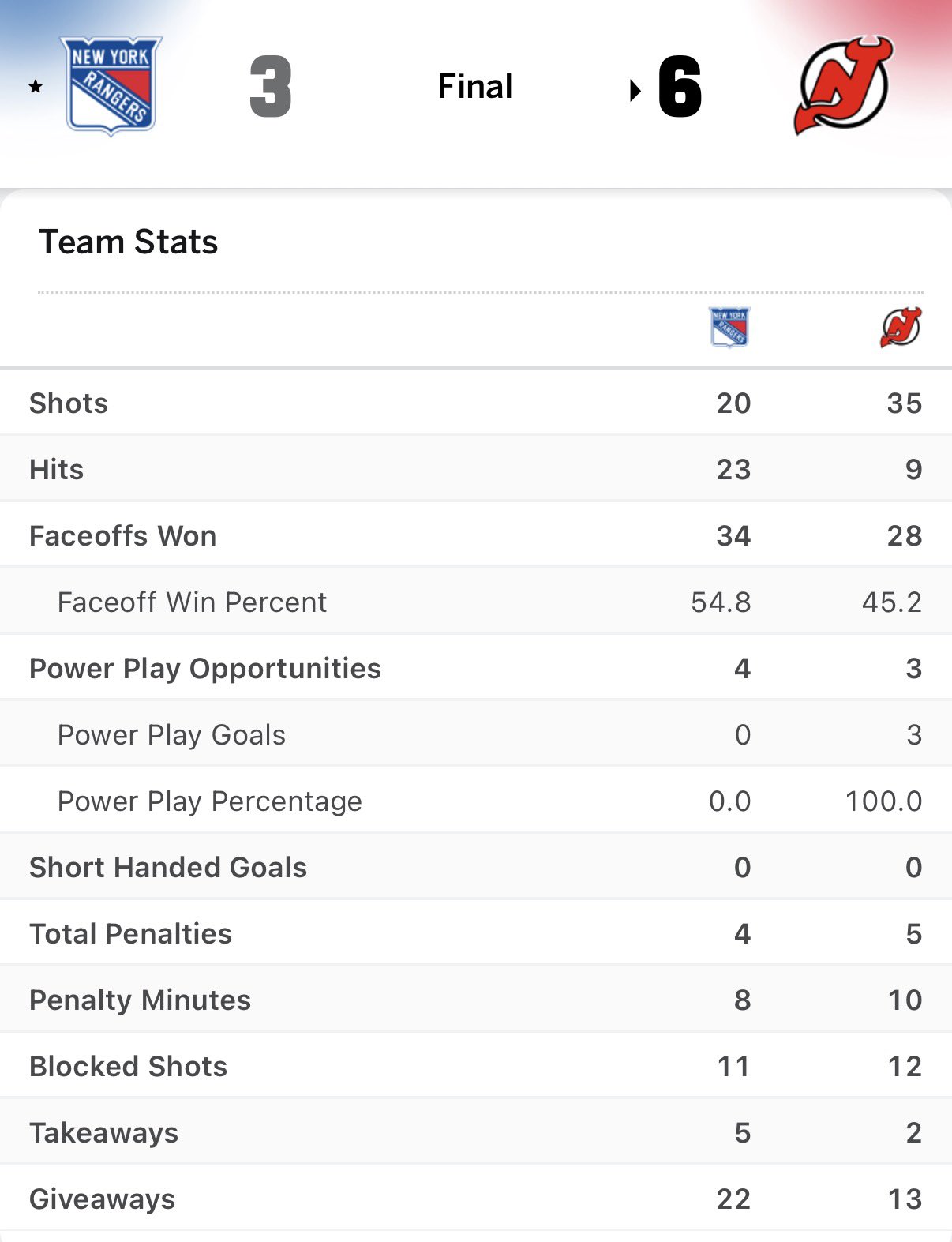 — Funny enough, the Devils have been much better at 5 x 5 – but it’s #NYR who have three even-strength goals.