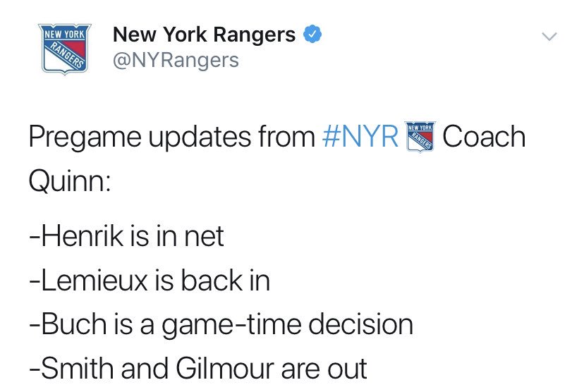 Going into this week, David Quinn said that Georgiev would get two of the last three games. However, because Lundswiss is sitting on career win 449 and only has 18 wins this season, David Quinn is reversing his thoughts. Now Quinn is saying he will give Lundqvist a chance to win 20 games.