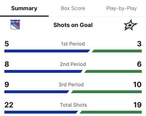 As I always say in this space – “SPECIAL TEAMS SWING GAMES” – and it was a 1/4 Stars’ power-play that was the difference – and especially when you consider the five man-up attacks that the Blueshirts blew.