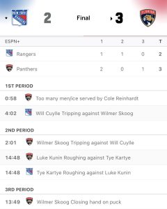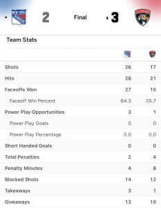 Following a first period SOG total of seven for each side, six more for both teams in the second, then come the third-and-final frame – and the Blueshirts out-shot the Panthers 13-4 – and where it also took nearly eighteen-minutes of play for the soon-to-be former-and-reigning champions to pick up their second SOG of the last period of regulation play.