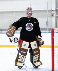 After the Rangers’ embarrassing defeat on their other home ice on Saturday night, the team returned to practice on Sunday prior to their flight to Raleigh – and where the big news was that CZAR IGOR was breaking in his new pads! At least he’ll look good during the Rangers’ first shutout of the New Year – and their first shutout while outdoors too! Whoopee! Photo Credit: NYR