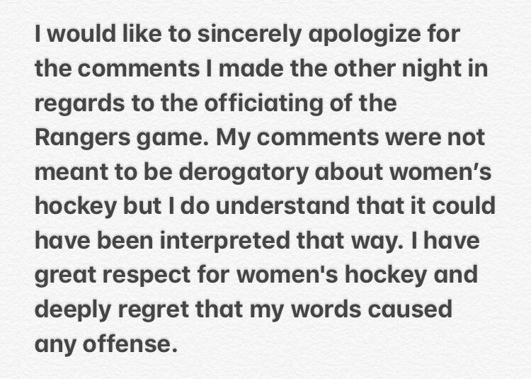 Check out this story from USA Today: https://www.usatoday.com/story/sports/nhl/rangers/2018/01/22/rangers-analyst-ron-duguay-suggests-officials-womens-hockey/1053220001/